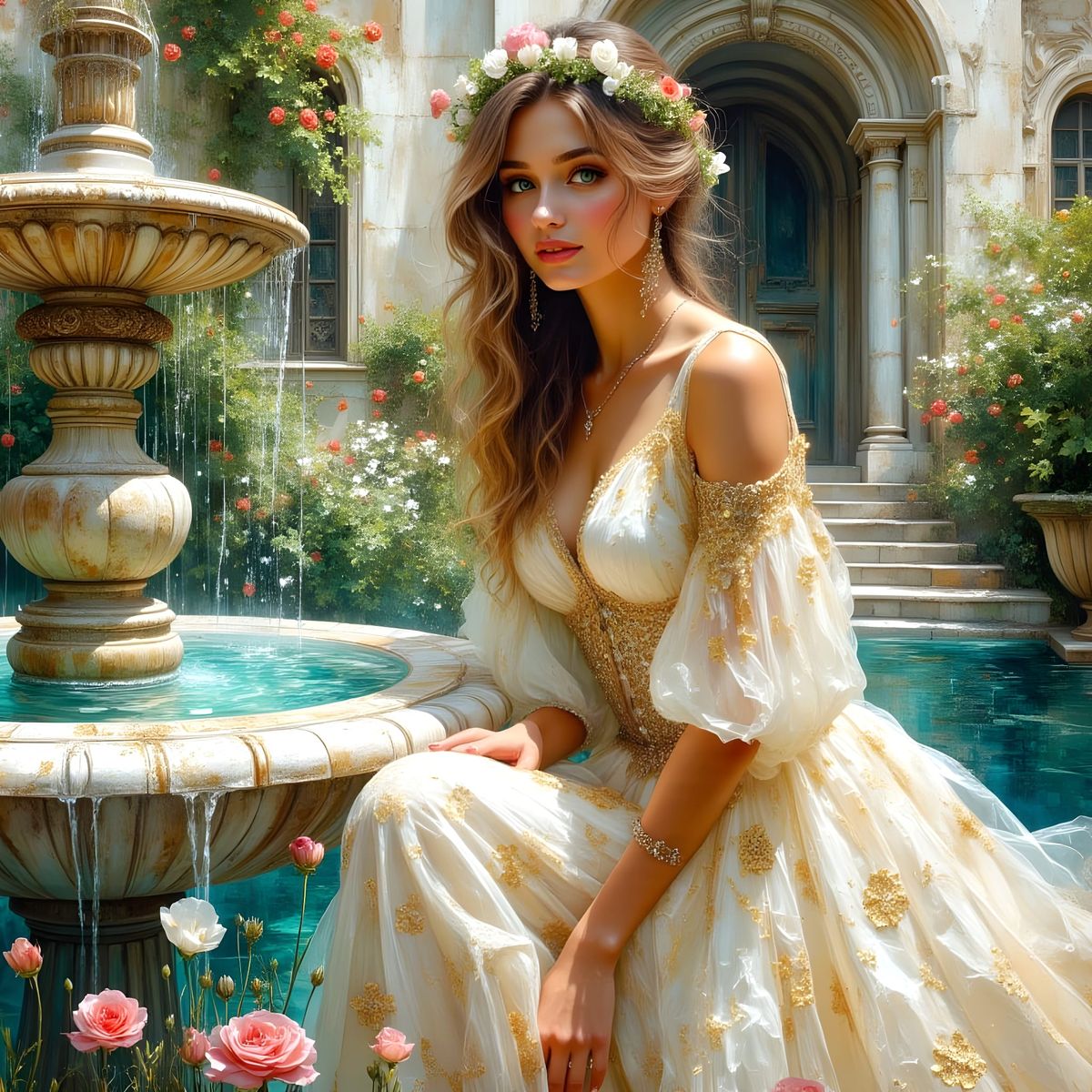 A detailed close-up of a smiling woman with striking eyes, wearing an elegant gown. The scene features a marble fountain in a lush courtyard bathed in sunlight, rendered with impasto and textural effects.