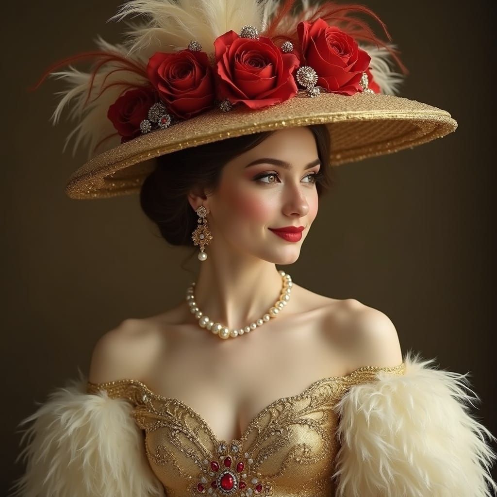 Young woman, 20s, light skin, European features, with a sophisticated and elegant demeanor, wearing a lavishly decorated, gold and ivory-colored gown with intricate embroidery and pearls adorning the shoulders and bodice. A dramatic, voluminous, red and white feathered shawl drapes over her shoulders. ...