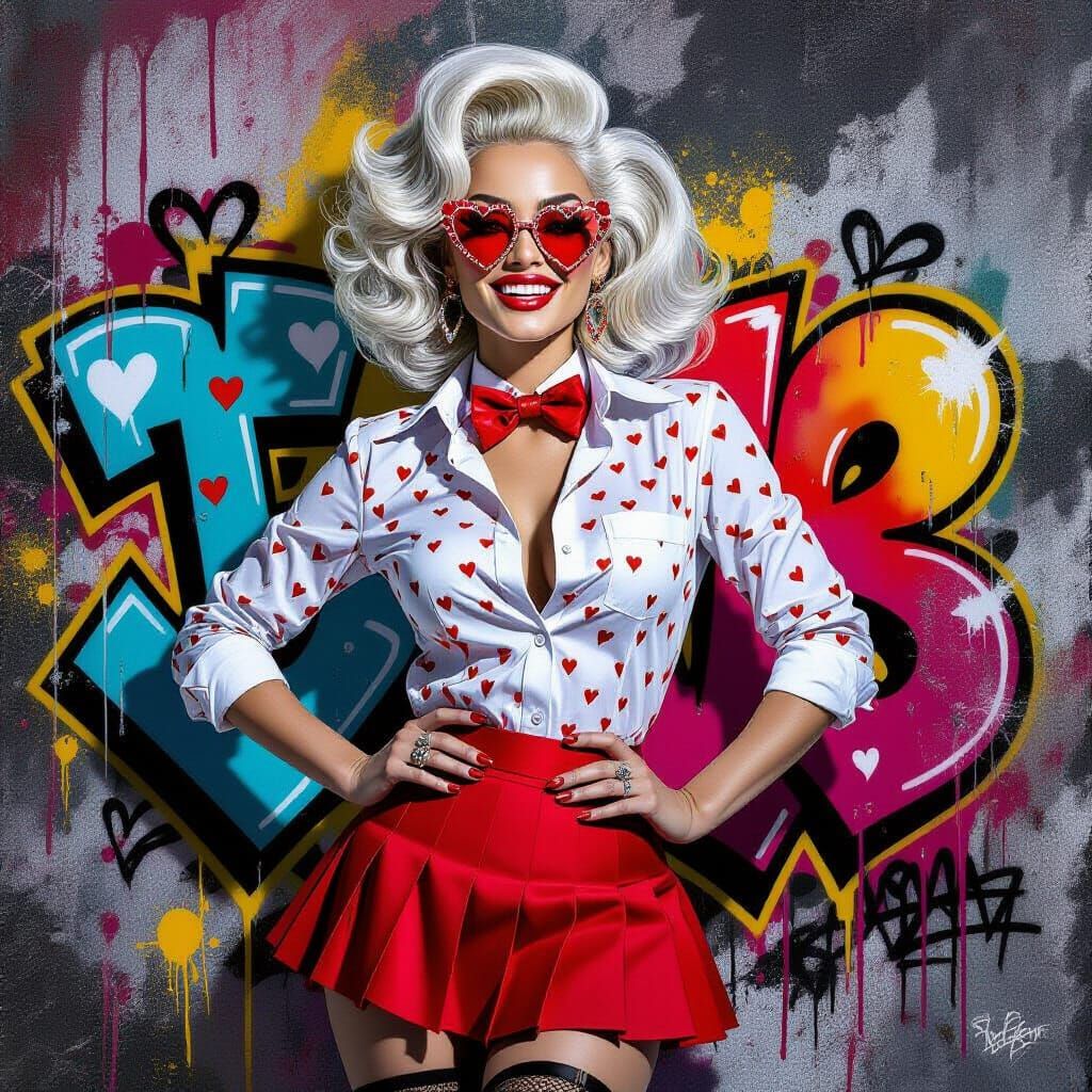A detailed image of a woman with platinum hair styled futuristically, wearing a heart-patterned shirt and pleated skirt. Rendered in a vibrant graffiti art style with mixed media elements.