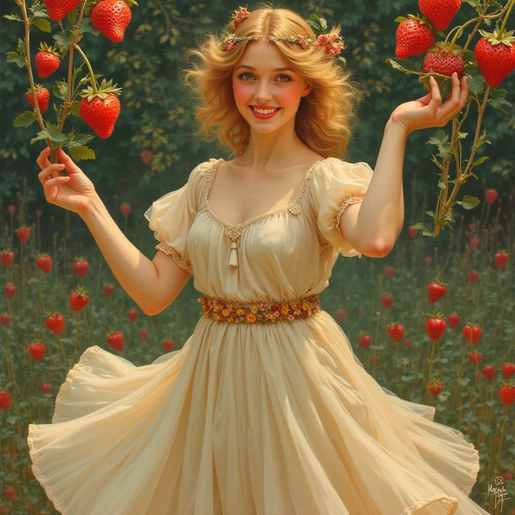 This image shows a delicate, dreamy portrait of a blonde woman dancing with strawberries, her porcelain skin and flowing hair capturing a whimsical, Art Nouveau-inspired atmosphere.