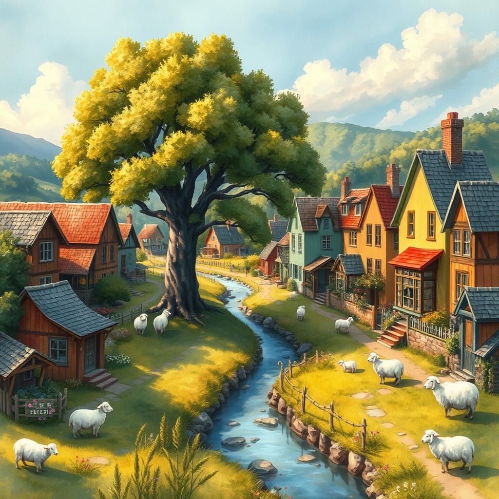 A striking picture of a vibrant rural village featuring colorful houses, a large tree, a river, and sheep, all in soft afternoon light. The artwork is reminiscent of naive art in a wet watercolor style.