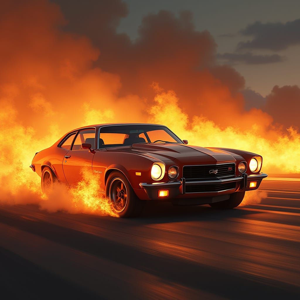 A vivid image showcasing an Opel Commodore navigating a fiery landscape under moonlight. The artwork features dramatic lighting and warm colors, creating a dynamic and atmospheric scene with photorealistic details.