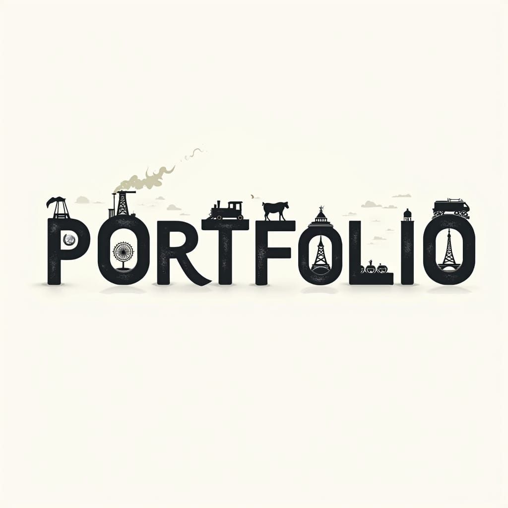 This image showcases the word 'PORTFOLIO' with each letter creatively symbolizing a different government ministry. The artwork features a blend of industrial and symbolic elements in a retro-futuristic style.