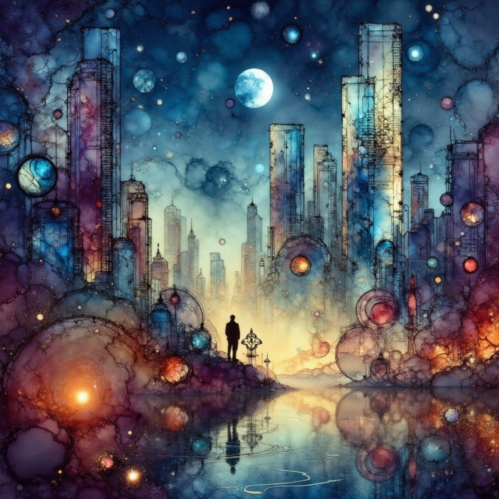 A surreal cityscape featuring dreamlike, shimmering buildings and iridescent windows against a graduated background. The image is reminiscent of futuristic landscapes and rendered in vibrant colors.