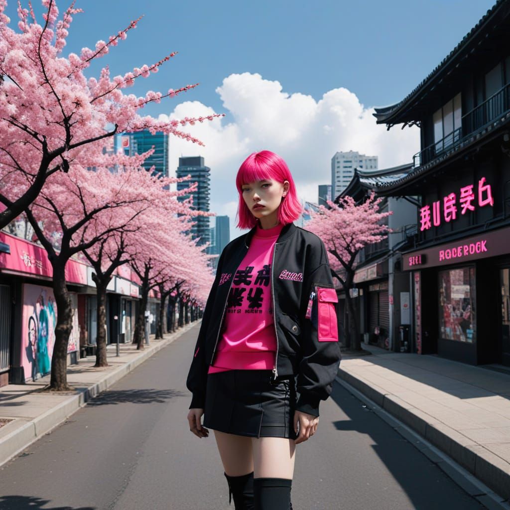 This image showcases a futuristic cityscape with cherry blossoms and a blend of casual and fancy elements, set against a bold hot pink and black backdrop, evoking the spirit of neo Tokyo pop culture.