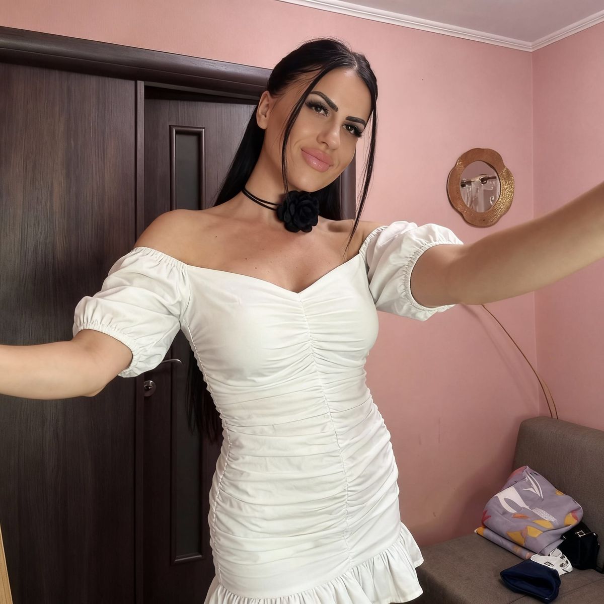 This image showcases a model maintaining her original features and attire, now presented in a new static pose with a selfie-style camera angle.