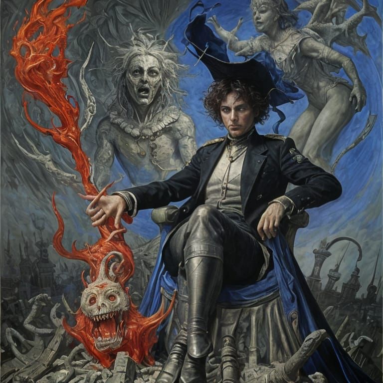 A surreal painting of a modern major general in an eclectic fusion style. The artwork evokes a sense of horror with detailed engravings.