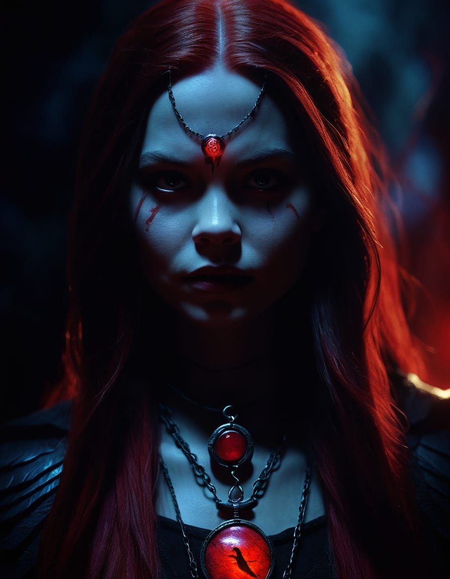 A medium shot of a superheroine with a red soulstone glowing on her forehead. The digital painting features a dark, mystical atmosphere and dynamic lighting. The character has an athletic physique.