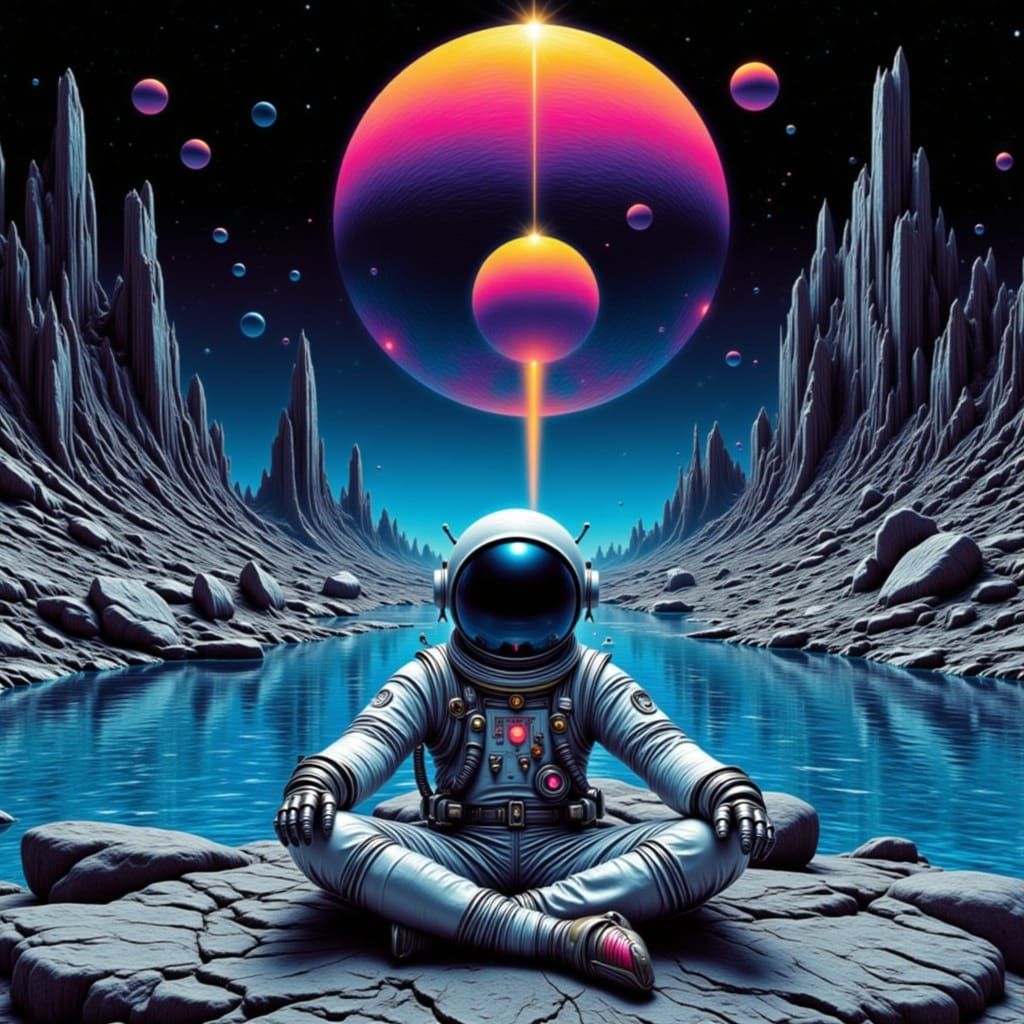 This image shows an astronaut in retro-futuristic gear on an alien moon's crystalline lake. It features vintage sci-fi art with surreal elements, sharp lines, and vibrant colors.