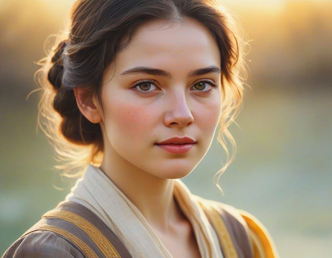 A watercolour portrait of a woman in historical clothing. The artwork features soft focus, delicate brushstrokes, and gentle water textures, bathed in warm golden light with pastel colours.