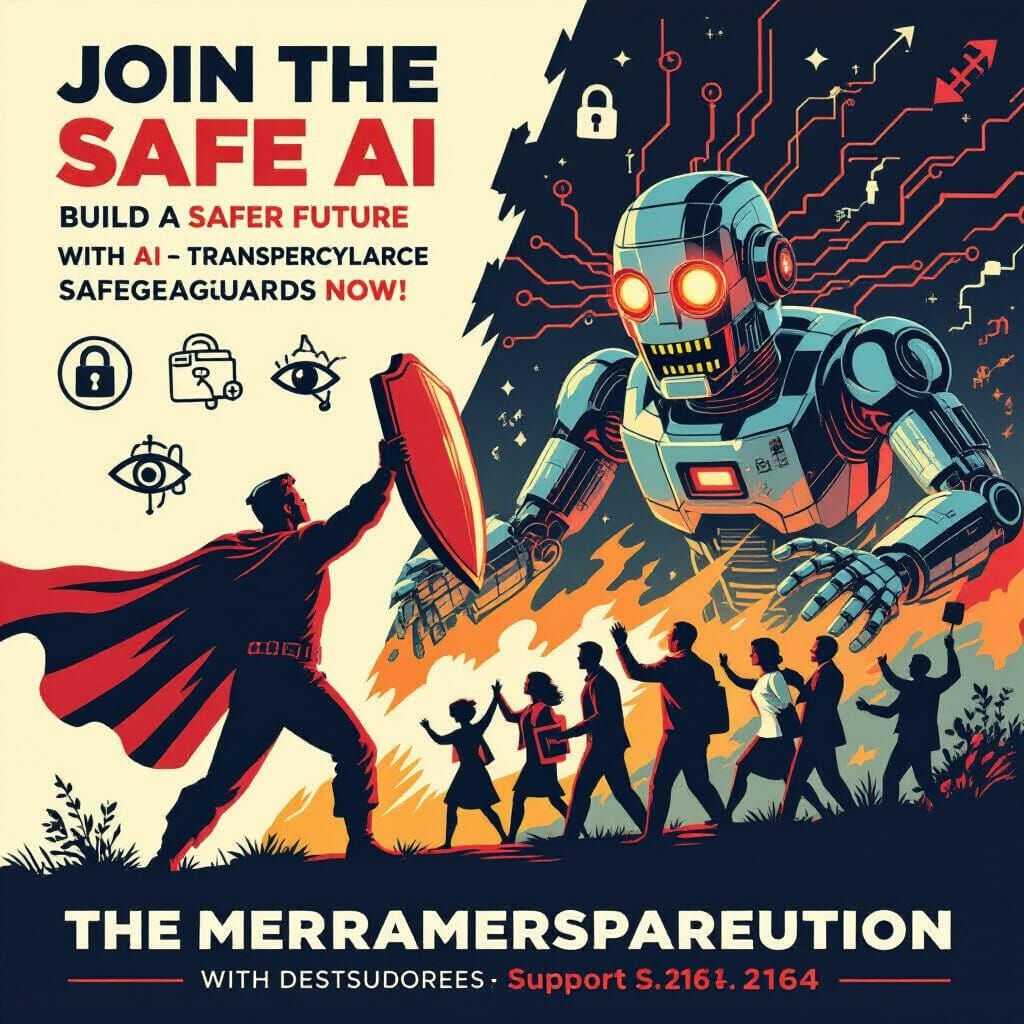 This image is a vintage propaganda-style poster promoting the Safe AI Coalition. It features a heroic figure defending people from a rogue robot, with symbols of security and oversight.