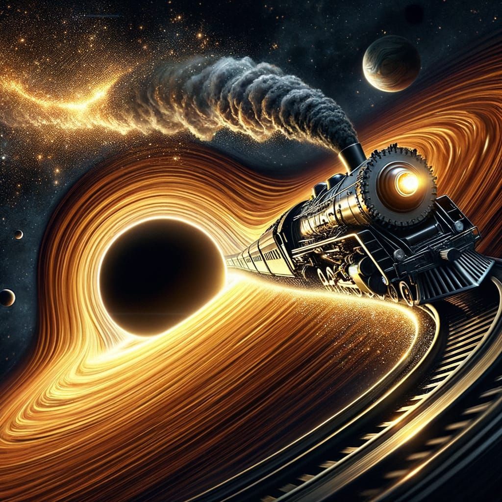 This image shows a cosmic train riding the edge of a black hole's accretion disc, surrounded by a halo of energy and stars, with planets in the background. The train's sleek design and golden accents glow against the dark space, surrounded by swirling stardust and energy.