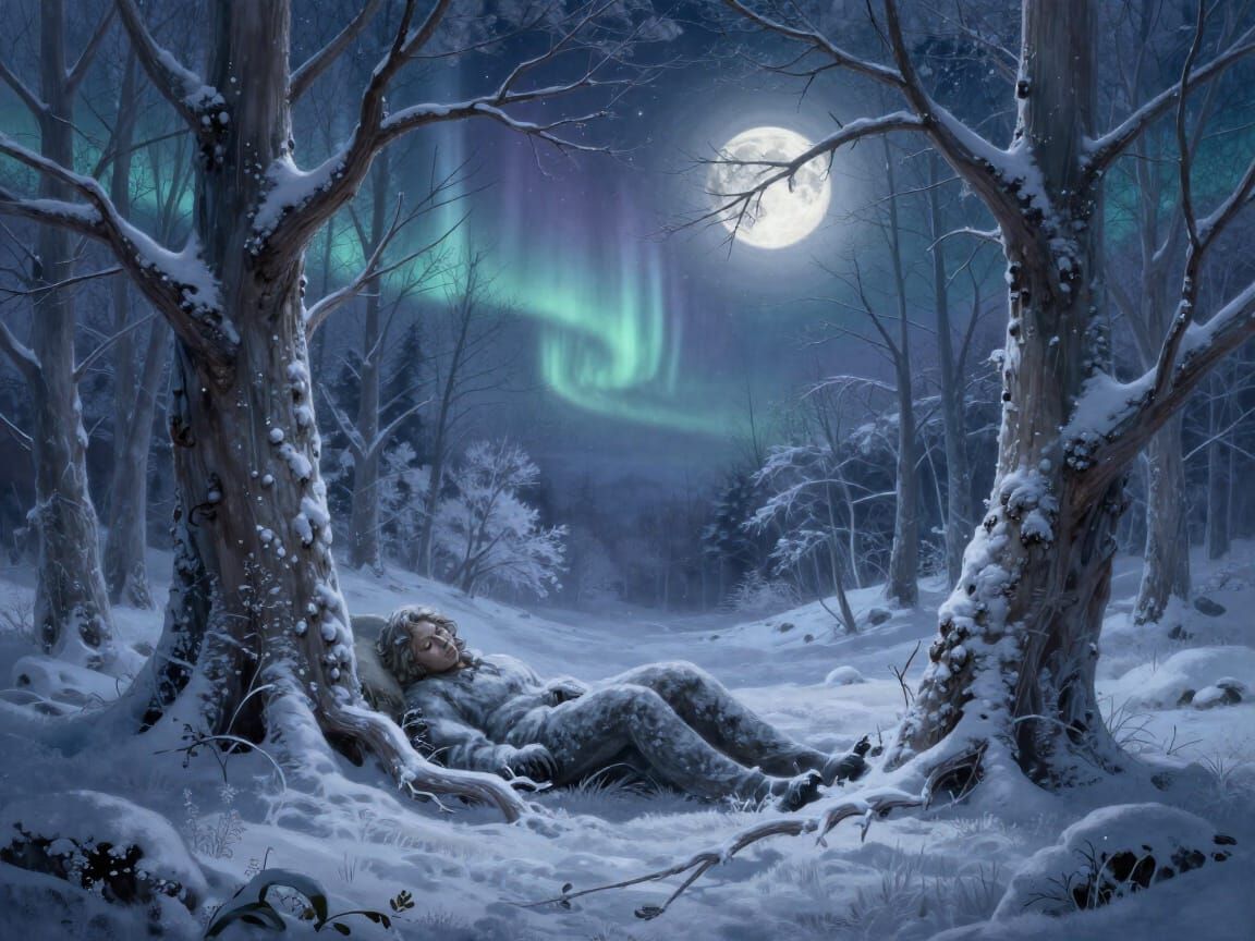 This image depicts a serene winter solstice scene, featuring ancient trees under a mystical, moonlit sky. Ethereal blue and silver light, aurora, and starlight illuminate the landscape in a digital matte painting style.
