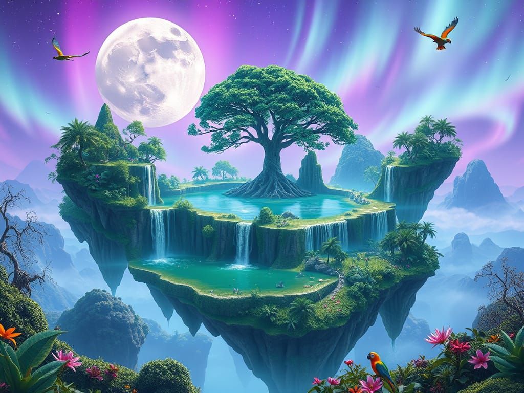 A vibrant, bioluminescent green landscape featuring a central Tree of Life, waterfalls, and lush flora on floating islands under a lilac aurora sky with a full moon. Detailed fantasy art.