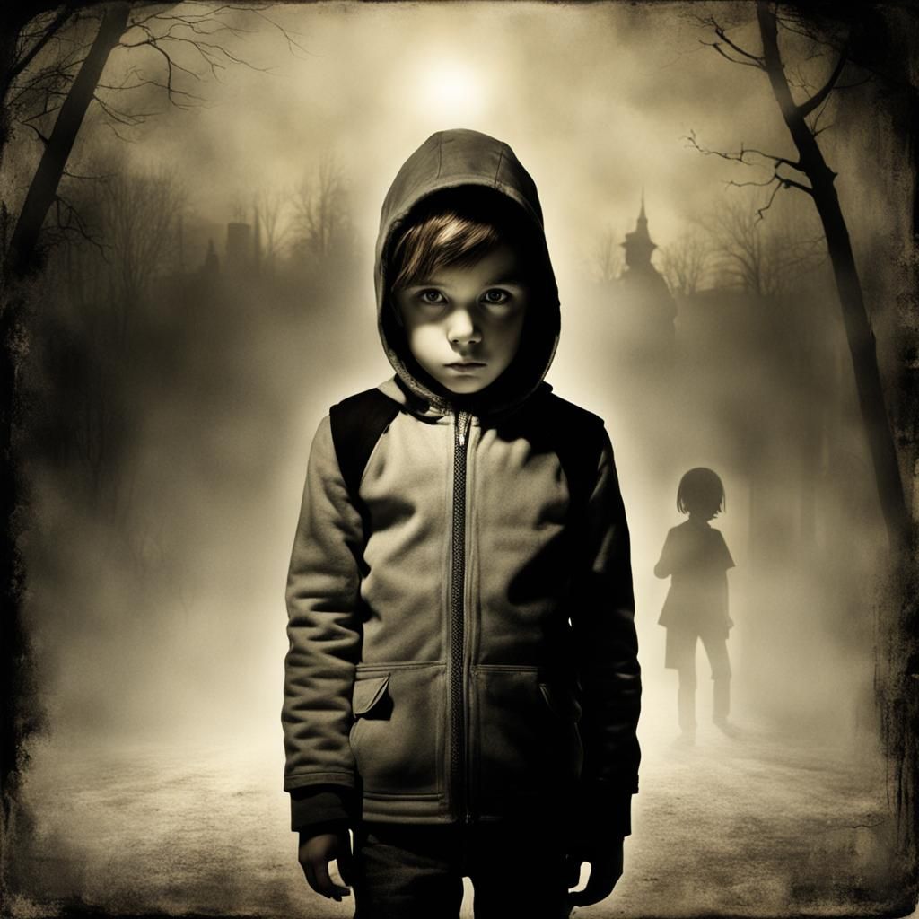 This image shows a surreal double exposure of childhood monsters and a courageous young person. Vivid eyes and dynamic light and shadow create an emotional scene, reminiscent of digital art.