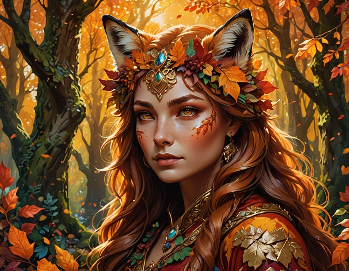 A striking picture of a fox woman in an enchanted forest. She has autumn-colored fur and leaves in her hair. The background is filled with vibrant trees and foliage, with warm light and rich colors in a fantasy art style.