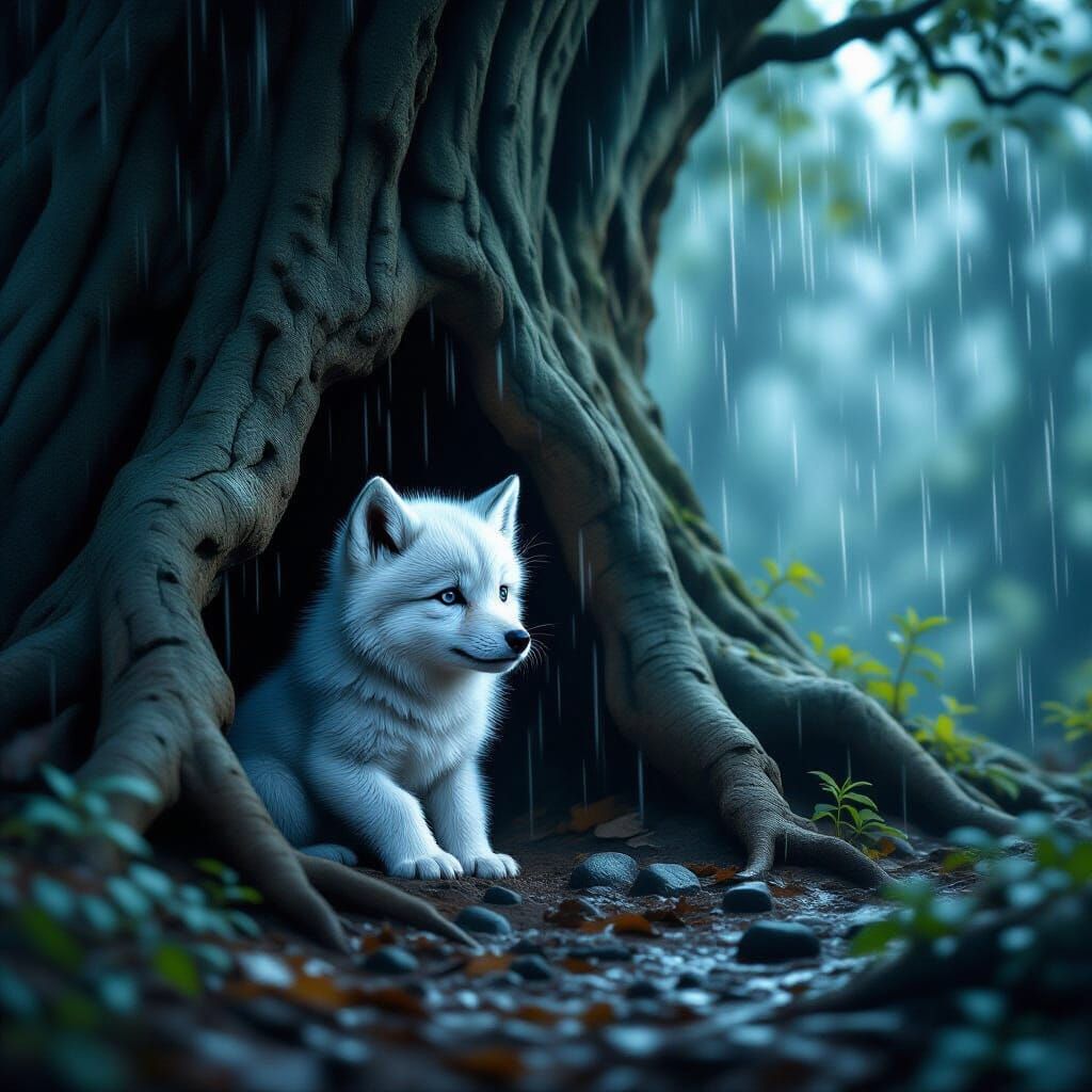 This image shows a small white wolf cub in a rocky den, looking out at the rain. It is a detailed digital matte painting with atmospheric lighting and rich colors.