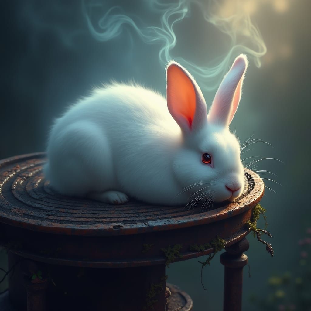 This image shows a serene white rabbit surrounded by mystical smoke and steam patterns, illuminated by warm golden light on a worn, ancient grill, evoking a captivating, high-fantasy atmosphere with deep blues and purples.