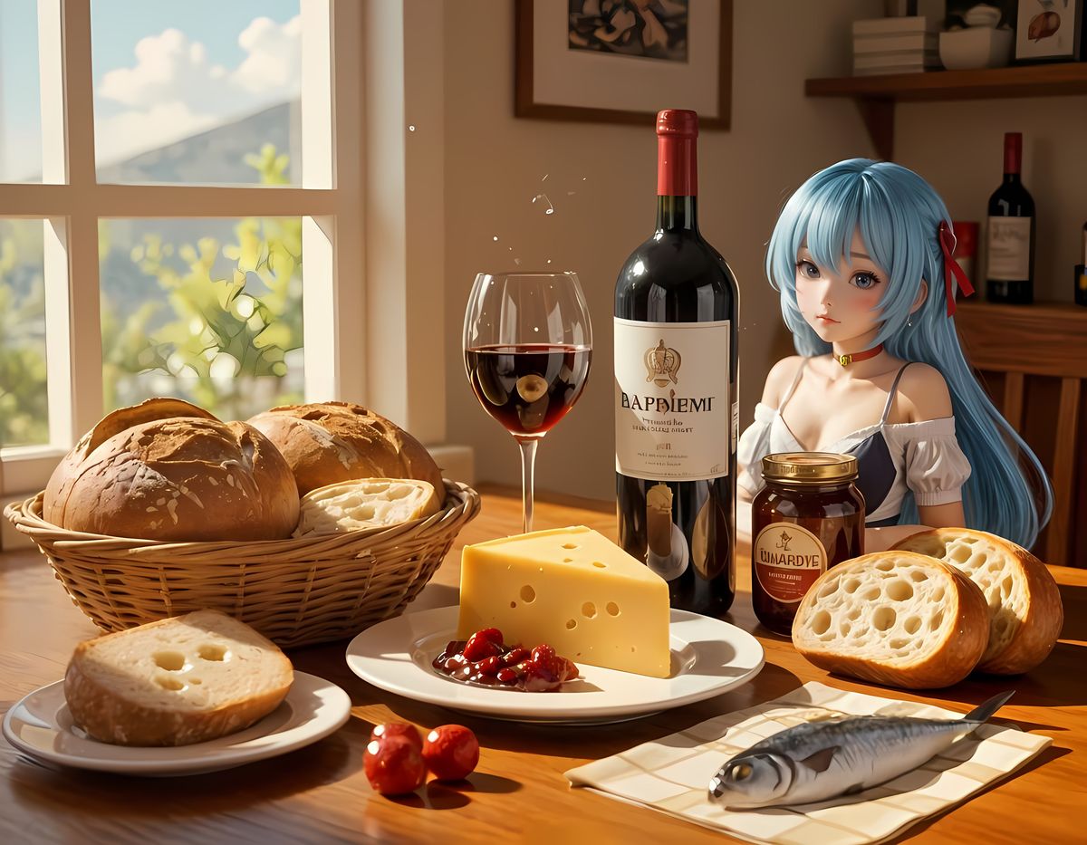 This image shows a picnic arrangement of bread, wine, cheese, jam, and fish. The scene is rendered in a detailed anime style with cinematic lighting and a vibrant, colorful aesthetic.