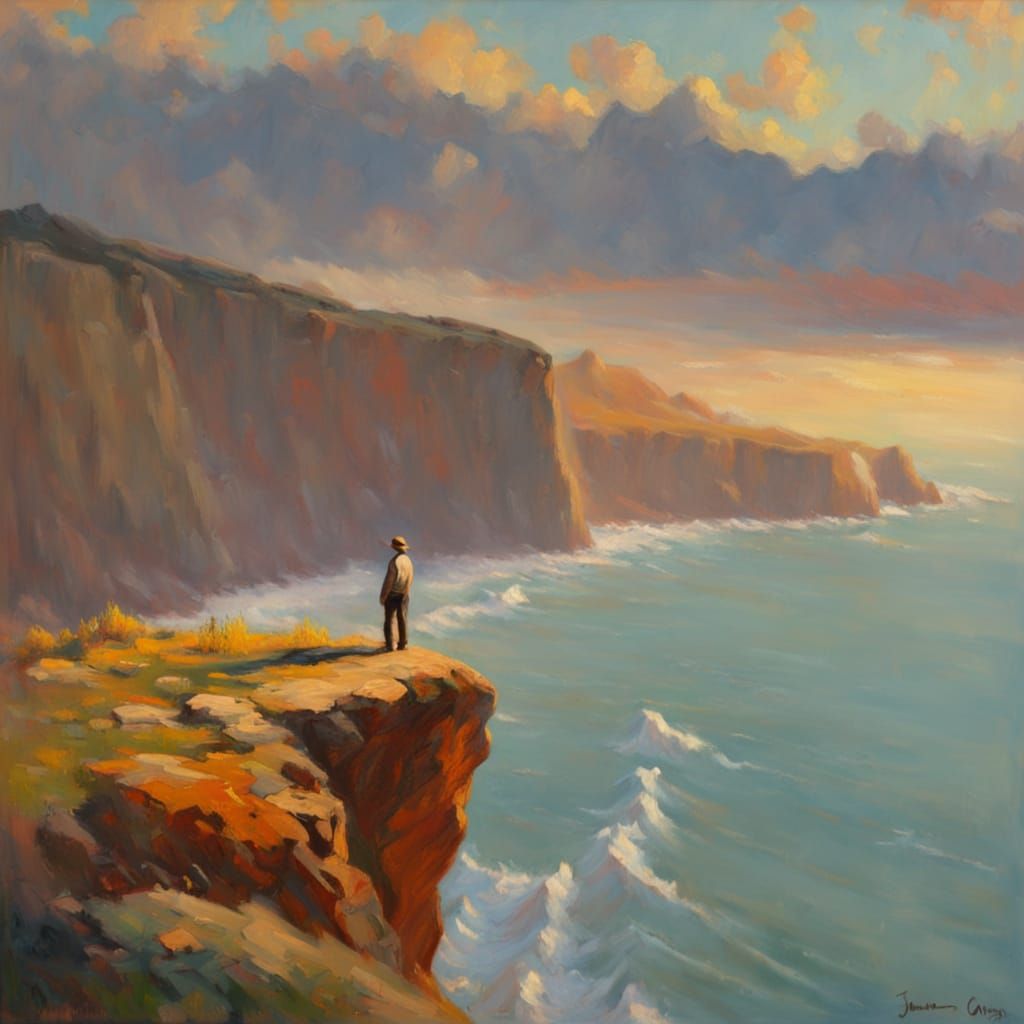 A vibrant impressionistic oil painting of a person standing on a cliff. The artwork uses soft brushstrokes, earth tones, golden hour lighting, and high contrast to capture a dramatic landscape.