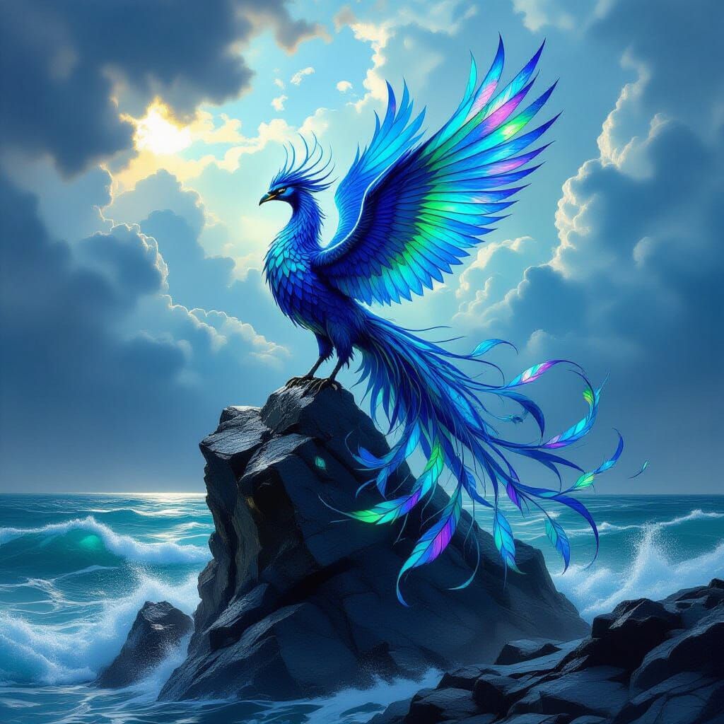 This fantasy concept art depicts a majestic phoenix with sea glass feathers in sapphire, emerald, and amethyst, perched on obsidian. A stormy ocean and dramatic sky provide the backdrop.