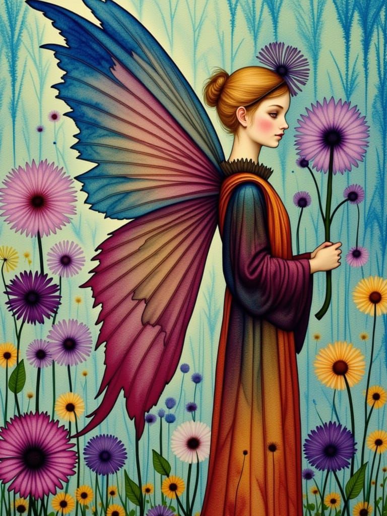 A watercolor painting of a fairy angel in a flower field. The artwork features flowing robes and vibrant blooms, in an elegant and whimsical style.