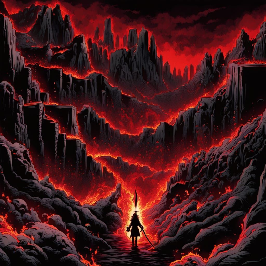 This image depicts a warrior woman wielding a fiery sword amidst a dark, eerie landscape, with intricate zentangle patterns on her armor and icy mist swirling around stone-carved mountains in the background, evoking a sense of mystery and ancient magic.