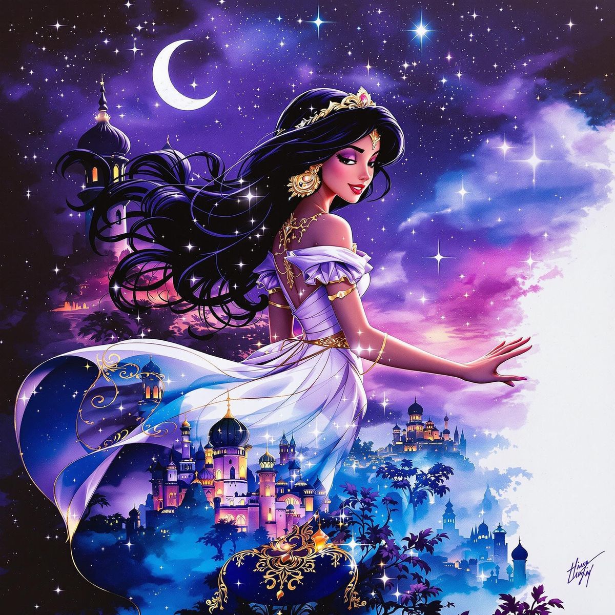A vibrant image of Princess Jasmine in a flowing robe amidst a magical Agrabah night scene. The artwork is reminiscent of colorful ink paintings with double exposure effects and deep blue hues.