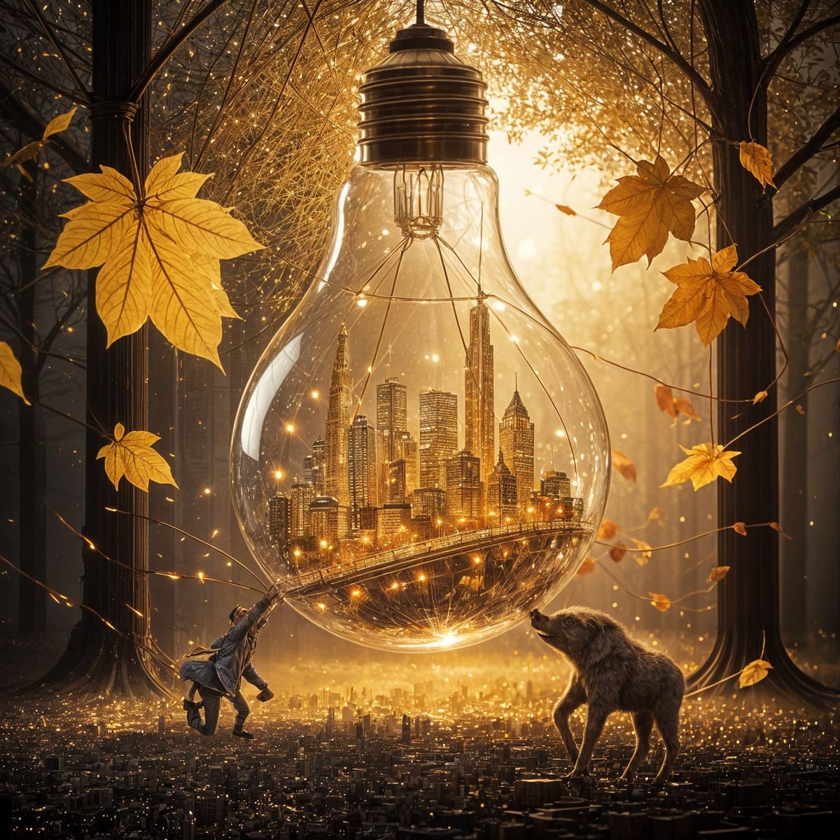 This image features a miniature, glowing city with copper wire skyscrapers inside a transparent glass bulb. It symbolizes human ingenuity and creativity.