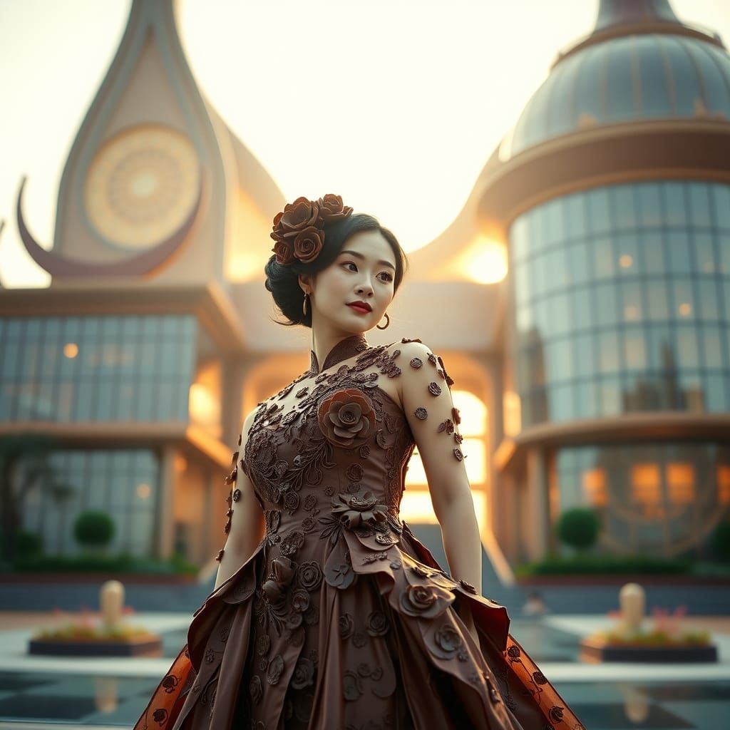 A beautiful Chinese woman models a chocolate gown with edible chocolate flowers before a chocolate building. Warm light accentuates the rich colors and textures in this cinematic film still.