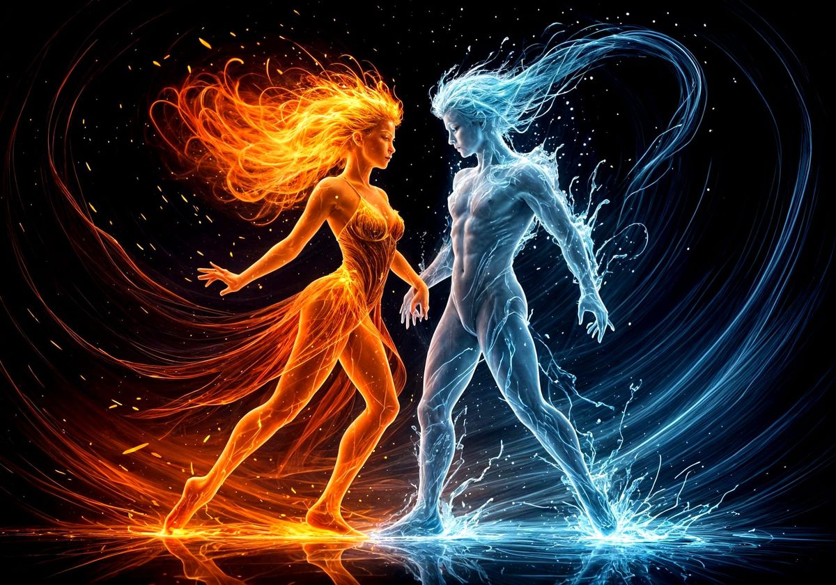 This image shows a dance between a woman made of fire and a man of ice. The expressive and energetic painting style uses bold contrasts to create a magical atmosphere.