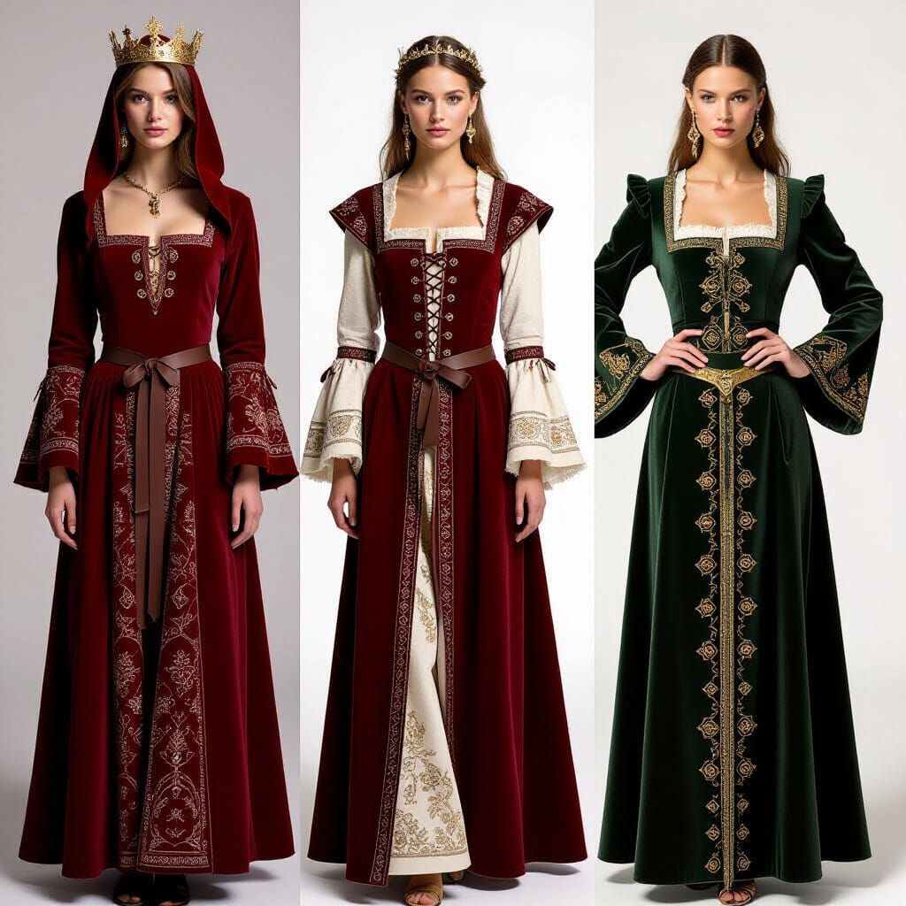 This image shows AI's interpretation of medieval fashion. The image showcases clothing styles, fabrics, and accessories typical of the Middle Ages.