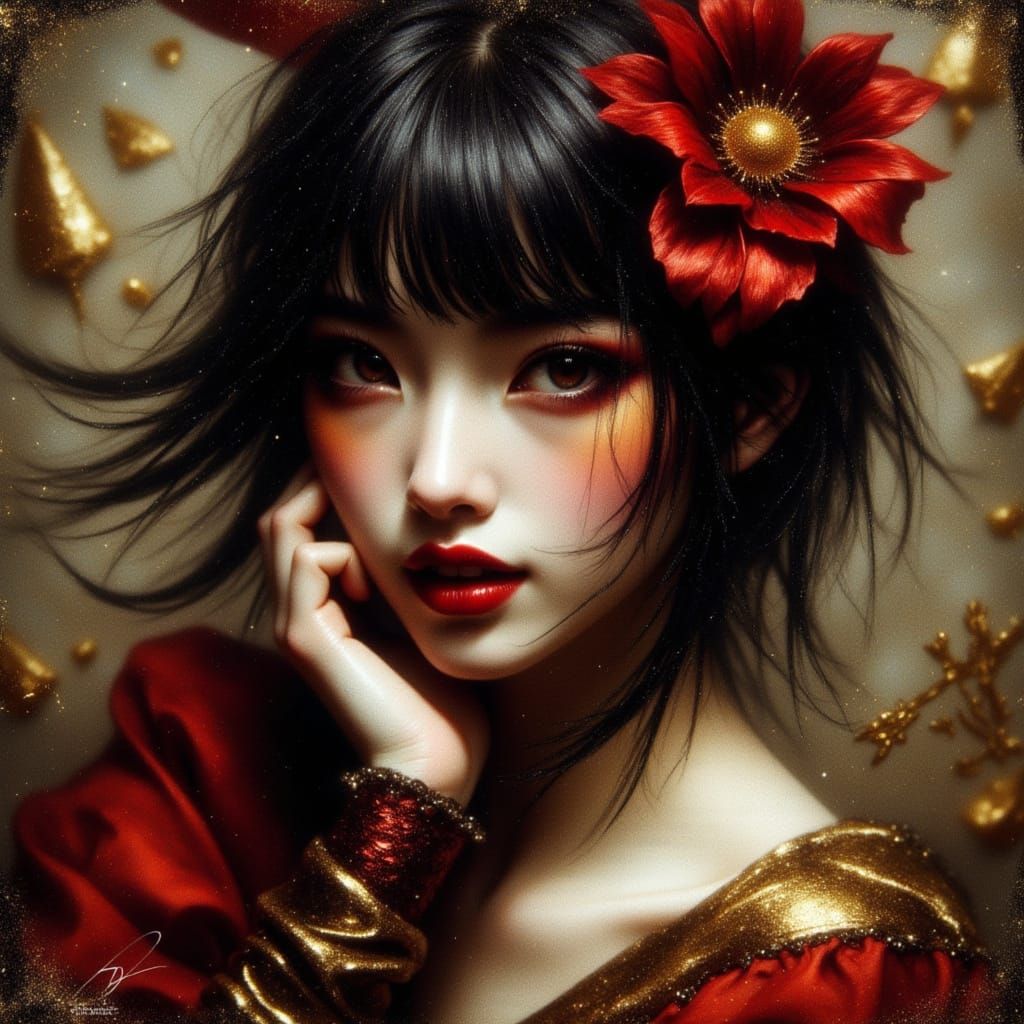 A hyperdetailed portrait of a beautiful punk queen with black hair and red lipstick, wearing a dark red and gold dress. The image is rendered in a cinematic, rococo style.