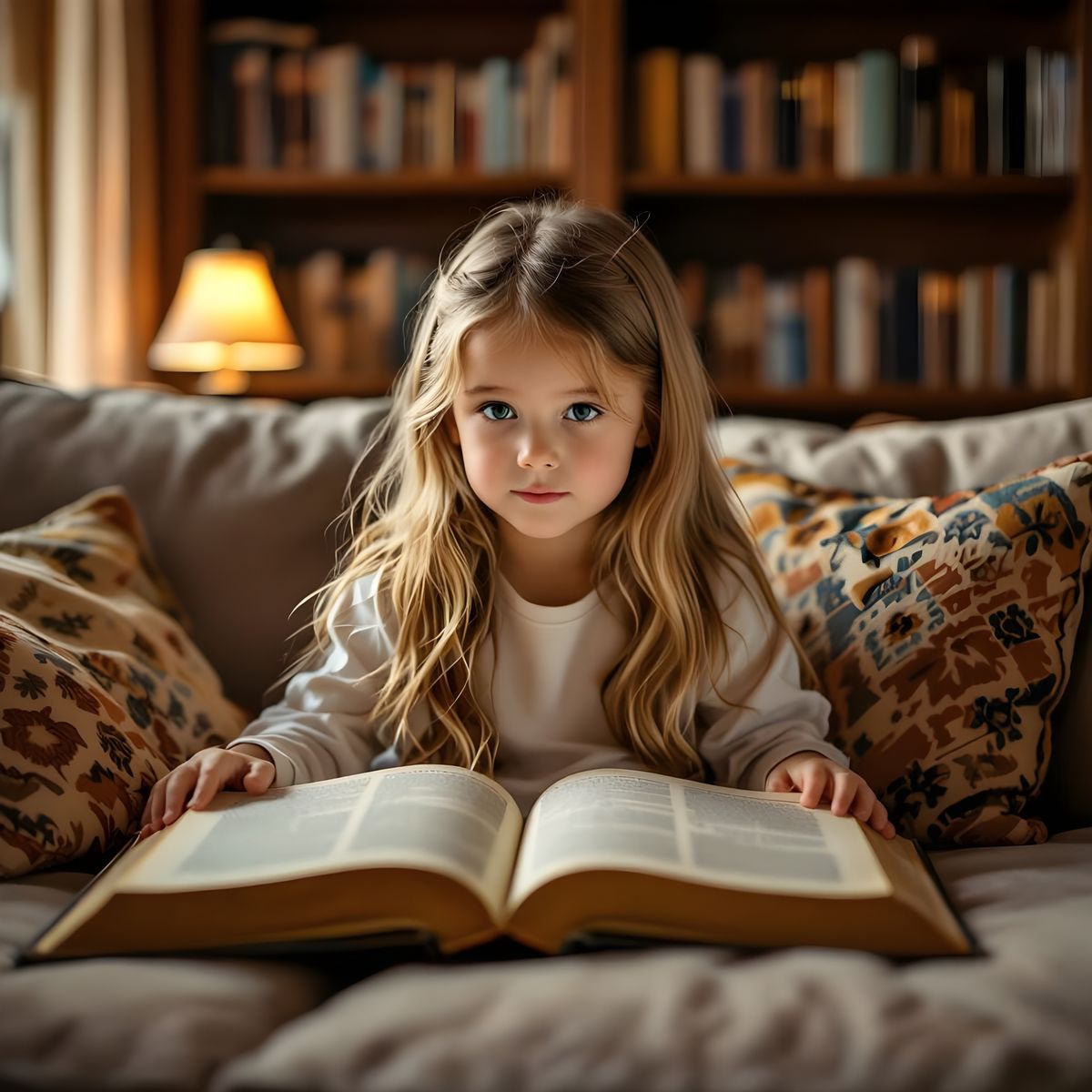 This cinematic image captures a young girl engrossed in a Bible storybook on a couch, bathed in warm, golden backlighting. Shot with film grain and a vignette for an atmospheric, masterpiece quality.