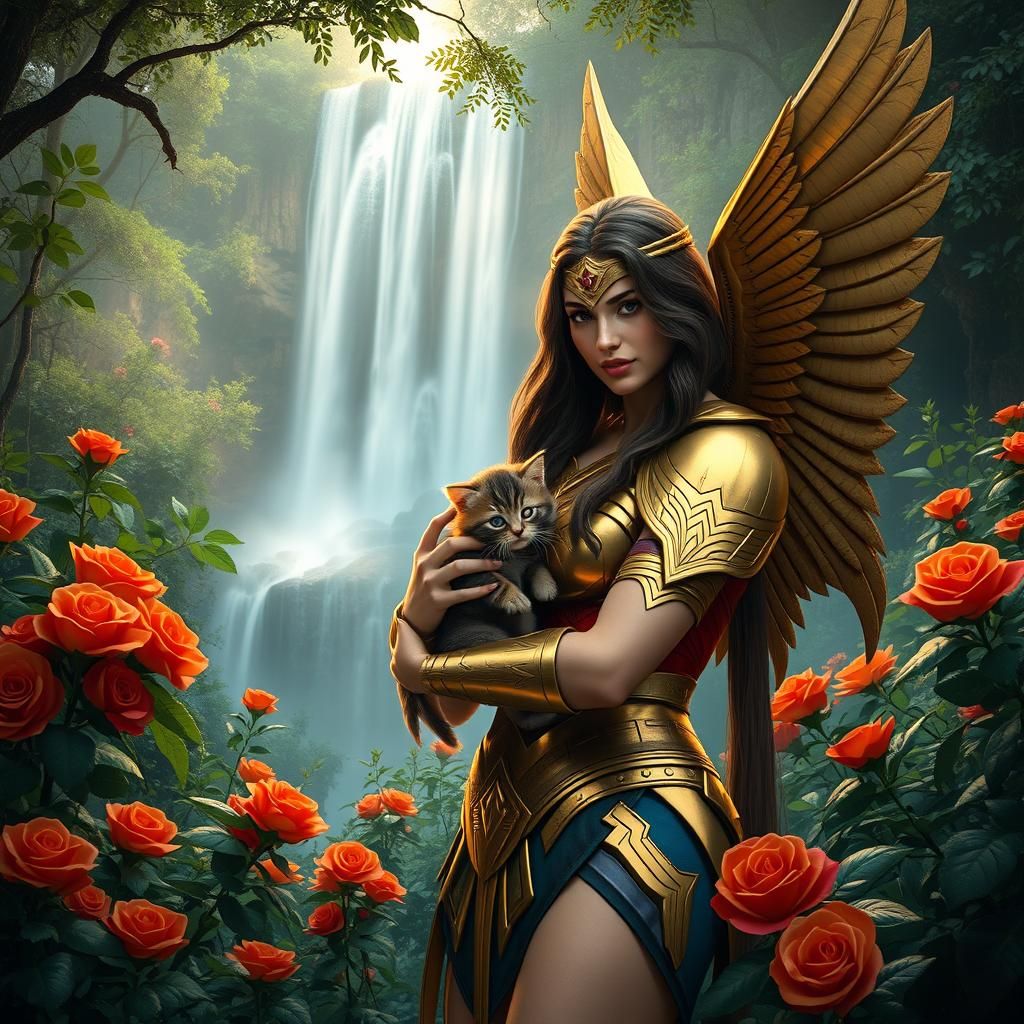 A vibrant image of Wonder Woman in golden armor holding a kitten in a rainforest. The background features a waterfall and roses, rendered with a deep color palette as concept art.