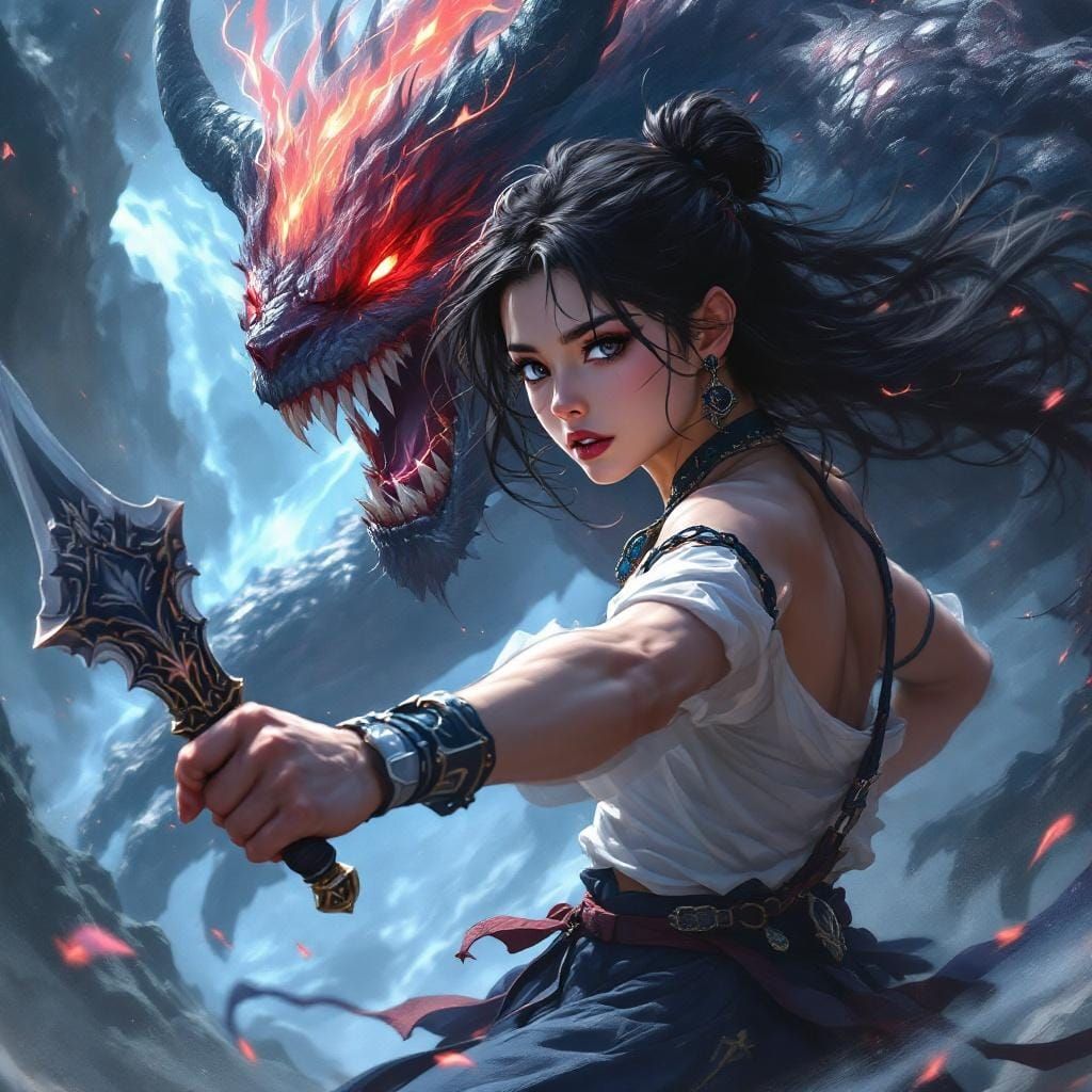 This image shows a spirited teen, daughter of Hades, with Korean features and black eyes, wielding a dagger against a monster in a mystical setting. The artwork blends fantasy and modern elements with vibrant colors and dynamic lines.