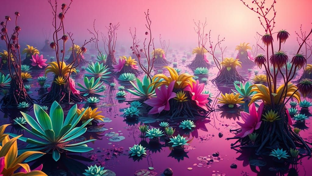 This image shows a vivid alien wetland scene with electric blue, lime green and hot pink flora. The plum-purple water evokes a sense of wonder in a cinematic, high-contrast landscape.