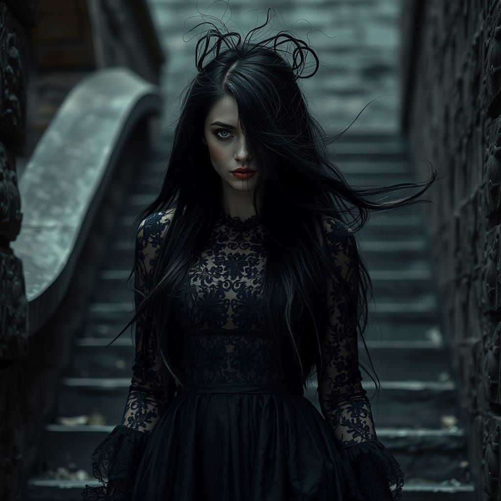 A captivating image of a gothic woman descending a dark stone staircase. The artwork is reminiscent of conceptual and fantasy art, with intricate details and contrasting colors.