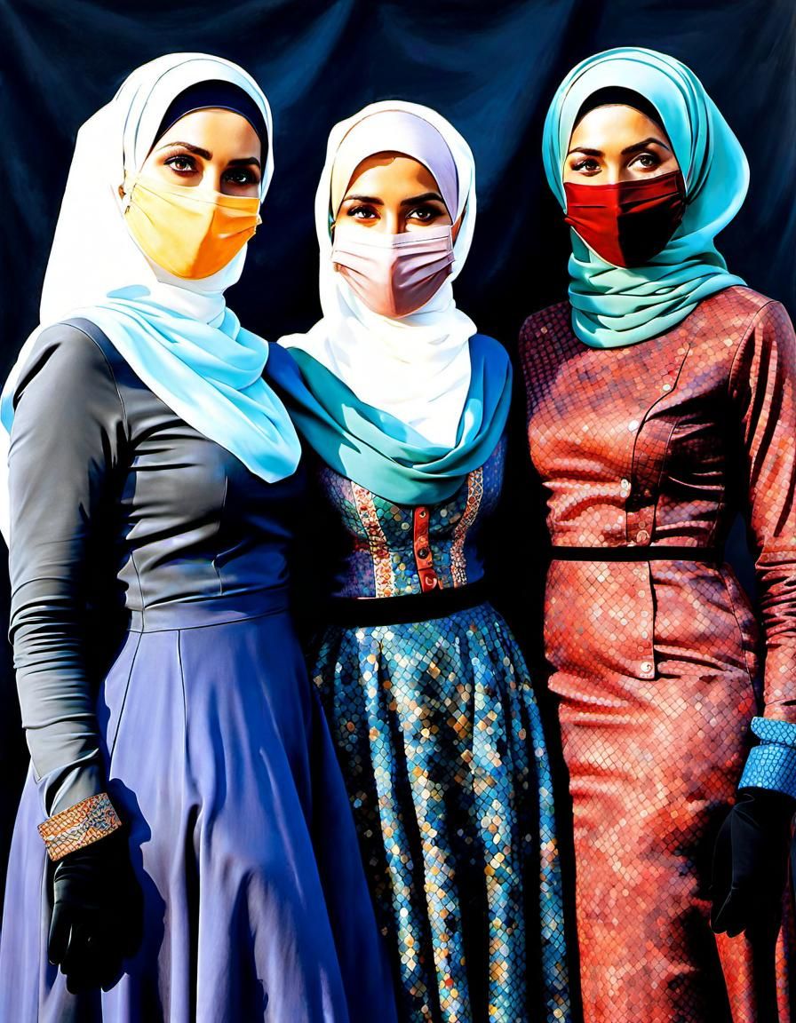 This image shows three Danish women in hijab and modest mosaic dresses, in an impressionistic style. The oil painting evokes classical portraiture with a focus on fabric and texture.