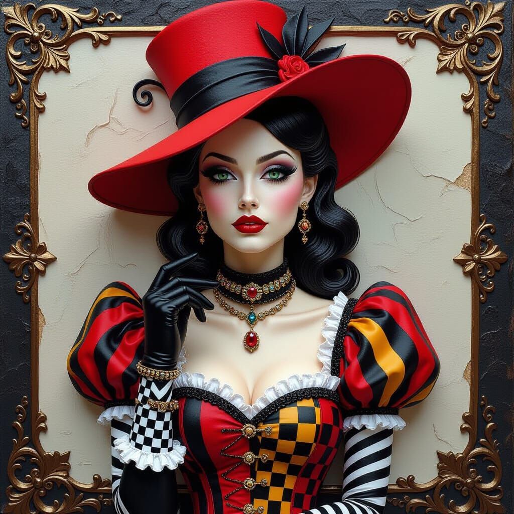 goth-punk lady, looking to camera, goth-punk dress, red hat, gloves, colorful, dramatic, zebra stripes, houndstooth, polka-dots, tartan, checkerboard, unexpected, whimsical surrealism
