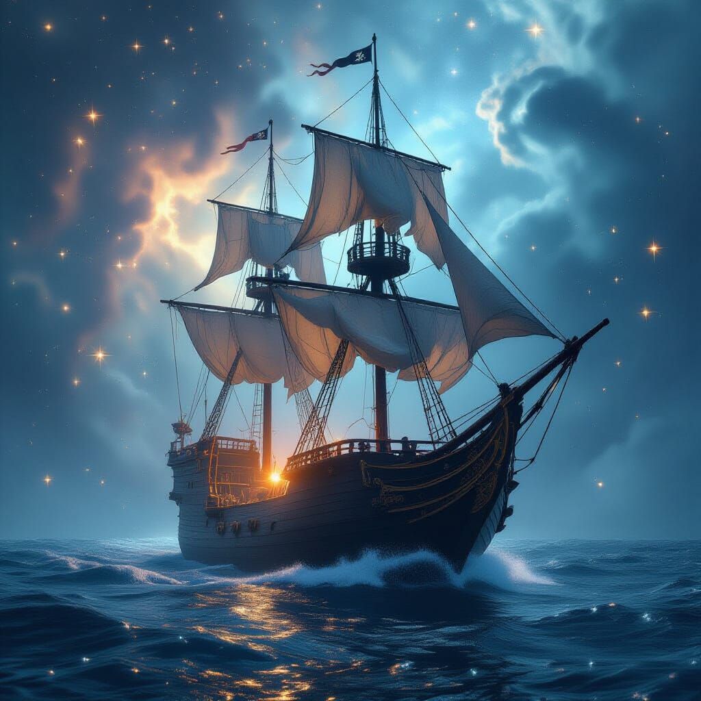 This photorealistic image captures a grand pirate ship navigating a swirling, dreamlike nebula. Ethereal light illuminates its sails as stars drift by, creating an epic, detailed scene.