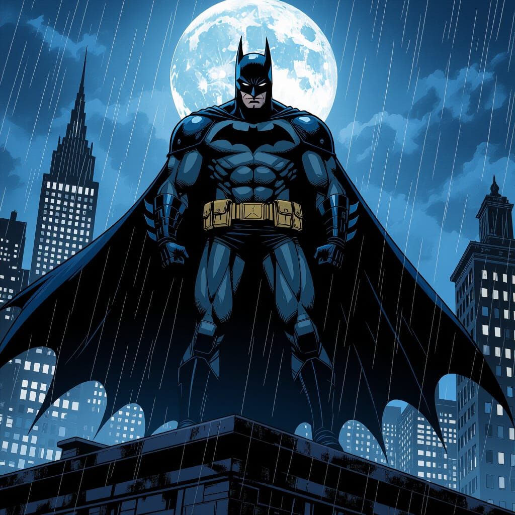 A formidable Batman stands silhouetted on a rain-slicked Gotham rooftop at midnight. His cape billows dramatically, projecting an aura of intimidation with stark, dramatic lighting.