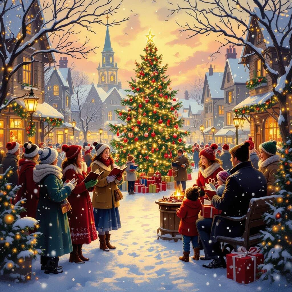 This image depicts a vibrant Christmas Eve town square, illuminated by warm golden light and gentle snowfall. A whimsical, illustrative style captures the cozy, joyful anticipation of the holiday.