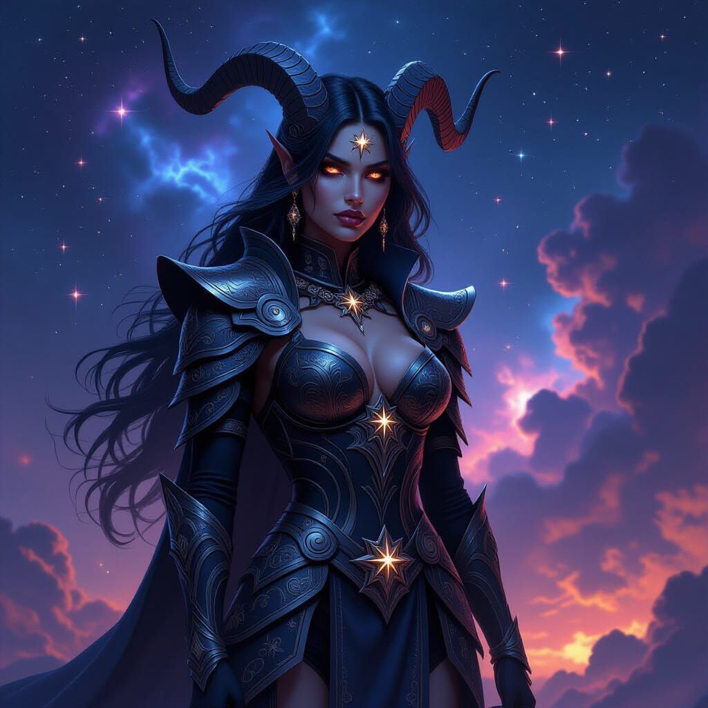 This image depicts a stoic female Capricorn embodiment with dark, starry skin and glowing constellations. She is clad in ornate armor against a cosmic backdrop, rendered in a dark fantasy concept art style with vivid colors.