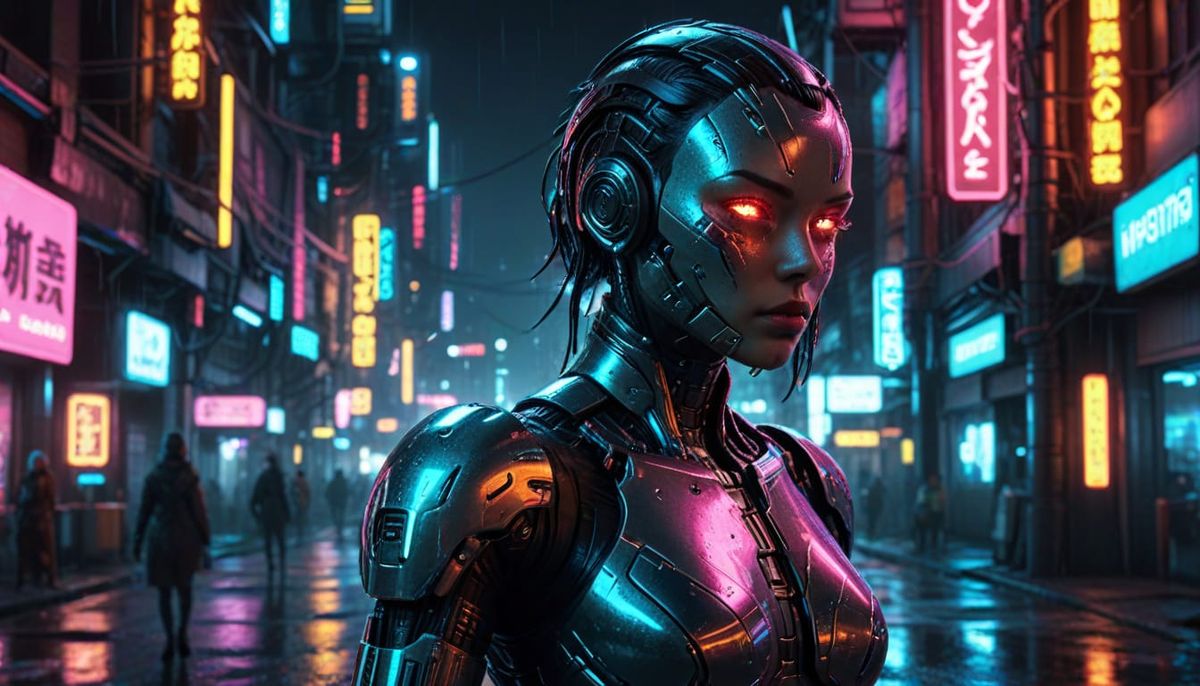 This image shows a female android standing in a futuristic cyberpunk city at night. The close-up shot highlights neon lights, metallic details, and a high-contrast, cinematic aesthetic inspired by anime and film noir.