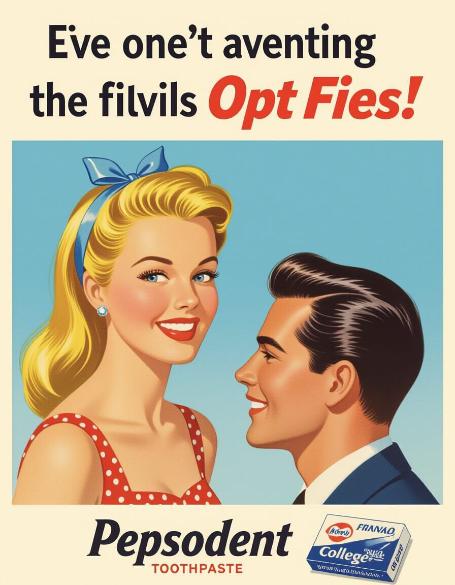 This image shows a vintage 1950s-style advertisement for Pepsodent toothpaste. A blonde woman with red lips smiles alongside a dark-haired man in a classic mid-century aesthetic.