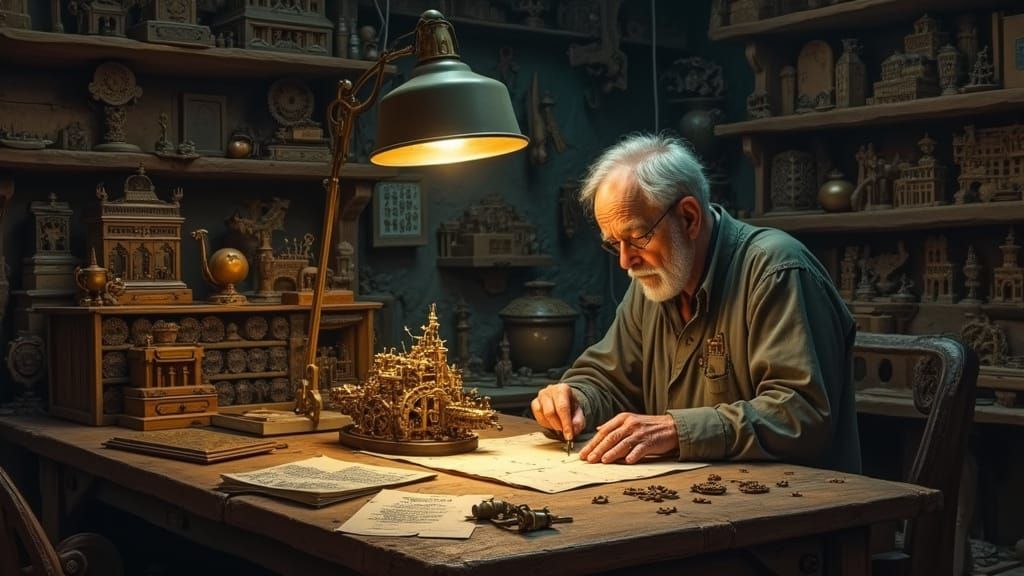 This image shows an elderly inventor in his workshop, focused on a wooden and brass mechanical puzzle. The scene features rich textures, warm light, and an atmosphere of quiet craftsmanship.