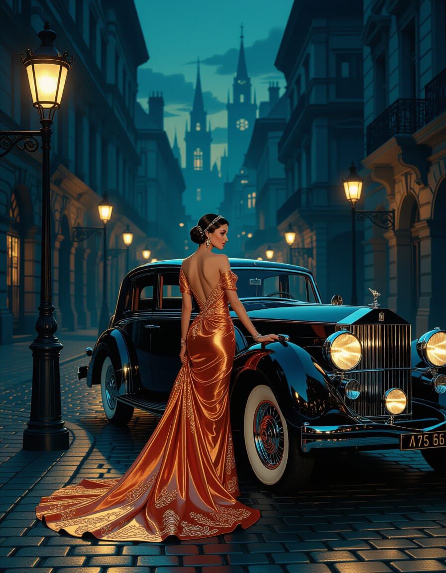 A sophisticated woman in flowing silks stands by a classic luxury car on a cobblestone street at twilight. Dramatic gaslight illuminates the scene, rendered with art deco and dark fantasy influences.