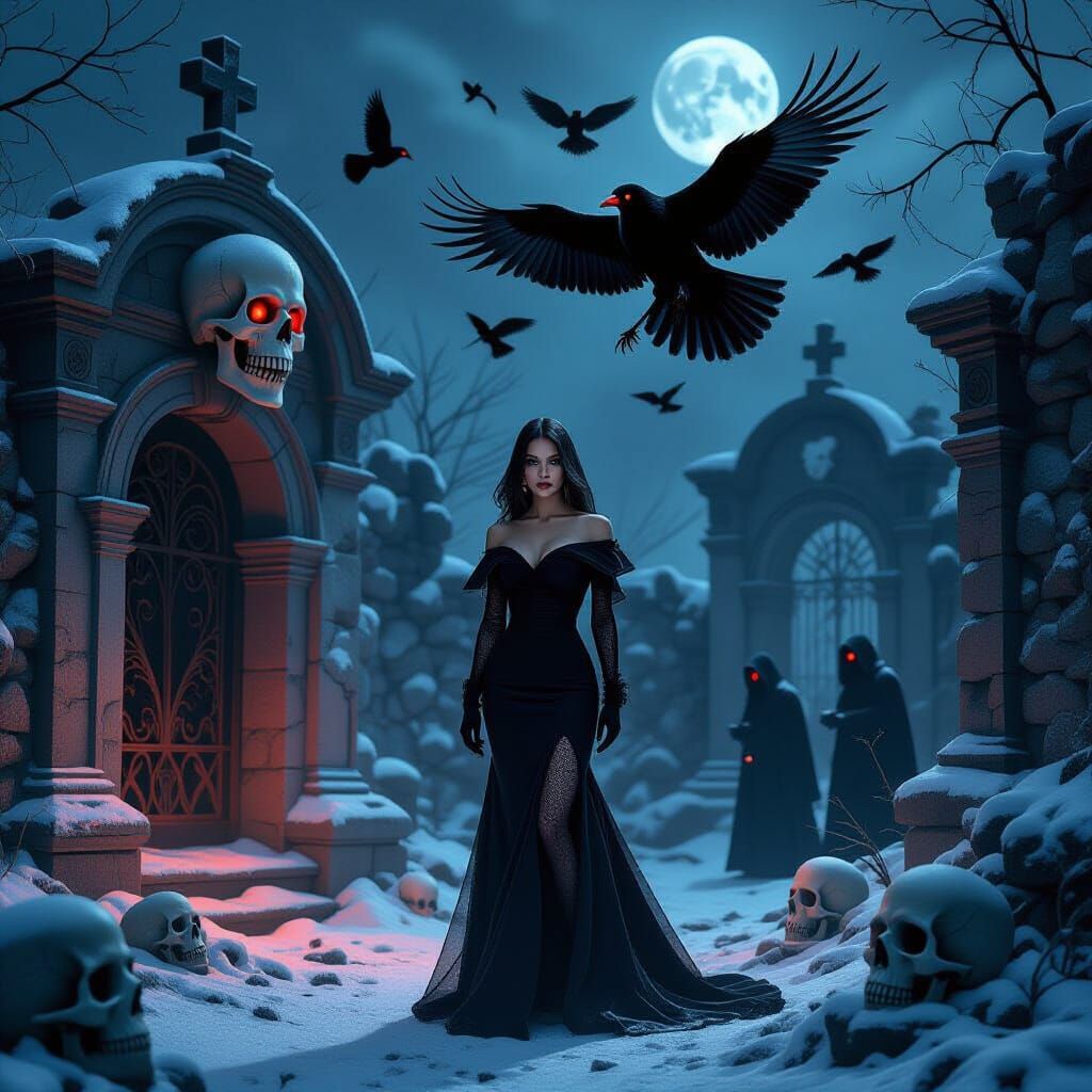 This image depicts ancient, haunted gothic tomb ruins at midnight. A ghostly figure in a mesh dress stands among macabre details, with crows flying over a skull. Features dark, atmospheric art with crimson accents.