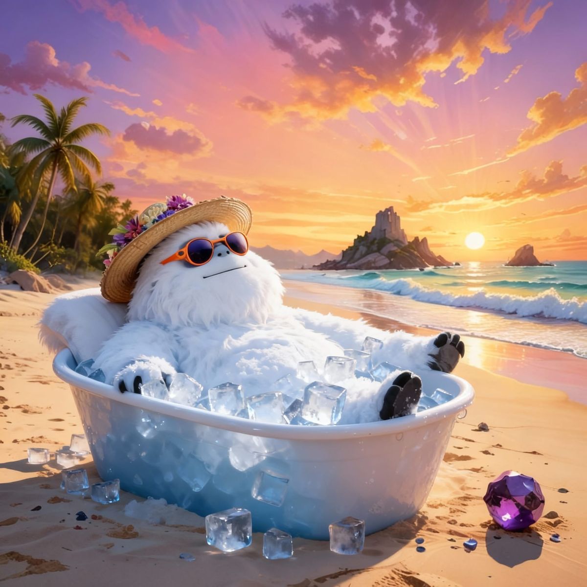Easily generate unique AI images of the Abominable Snowman enjoying a beach holiday. Free and fun!